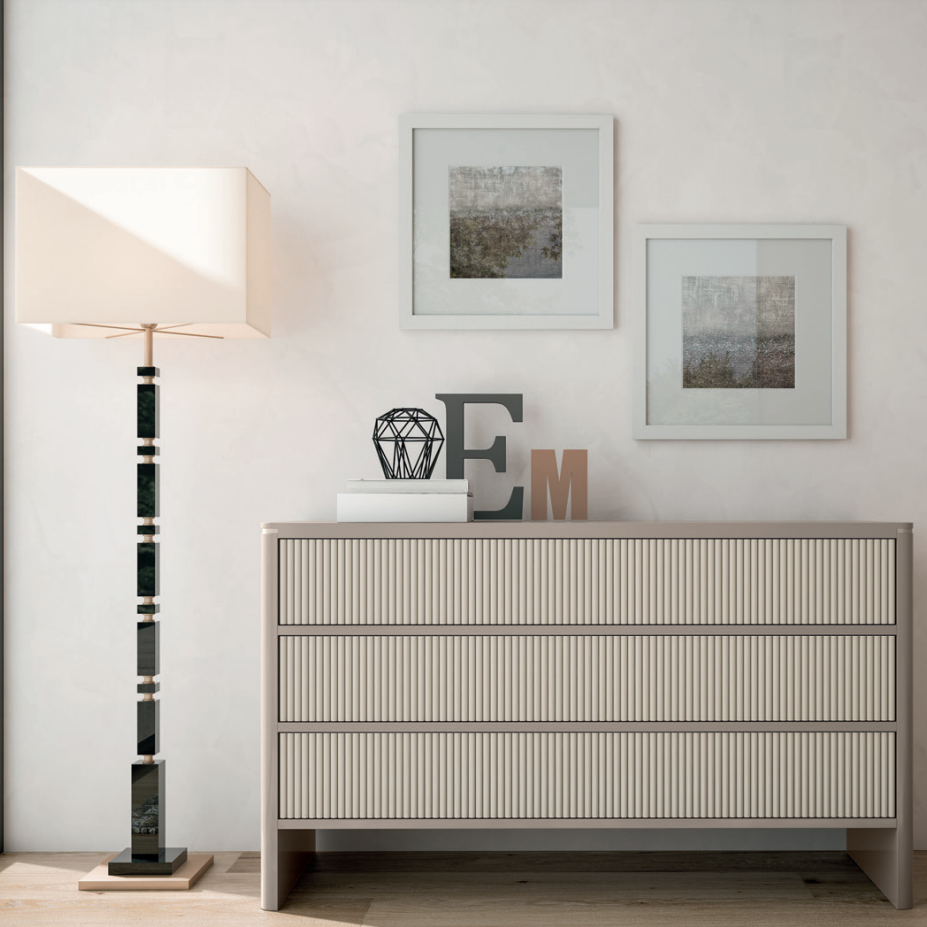 CASSETTI Legno con frontali laccati con disegno cannettè. Interno legno laccato e rivestito in microfibra.