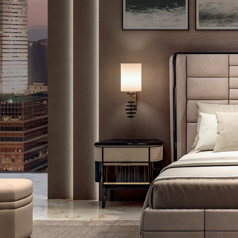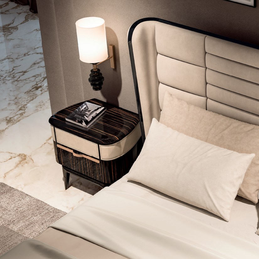 CASSETTI Legno con frontali rivestiti in pelle o tessuto. Interno legno laccato e rivestito in microfibra, apertura con sistema push-pull.