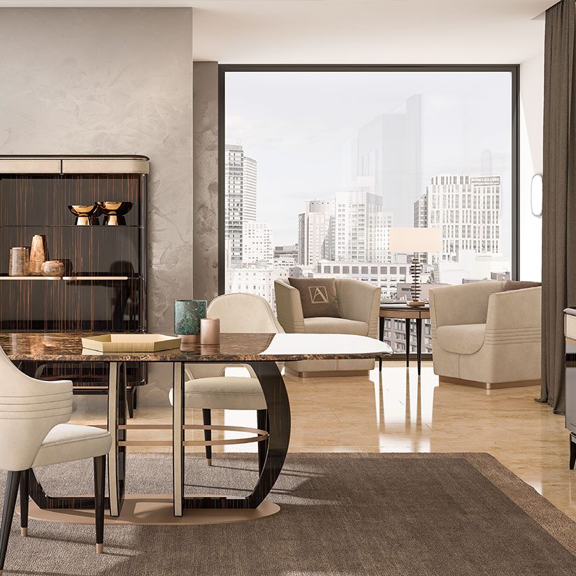 STRUTTURA Gambe in legno sagomato, impiallacciato o laccato. Dettagli in pelle.